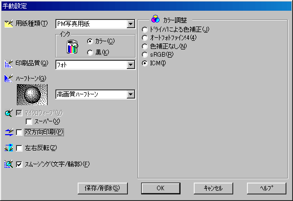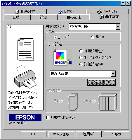 プリンタ設定の「メイン」シートで推奨設定のまま、 用紙を選択します。