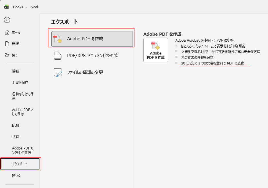 - エクスポートに「「Adobe PDF を作成」が増えています。