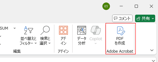 - [ホーム]タブの右端に Adobe Acrobat グループが作成され、「PDFを作成」ボタンが勝手に配置されていました。