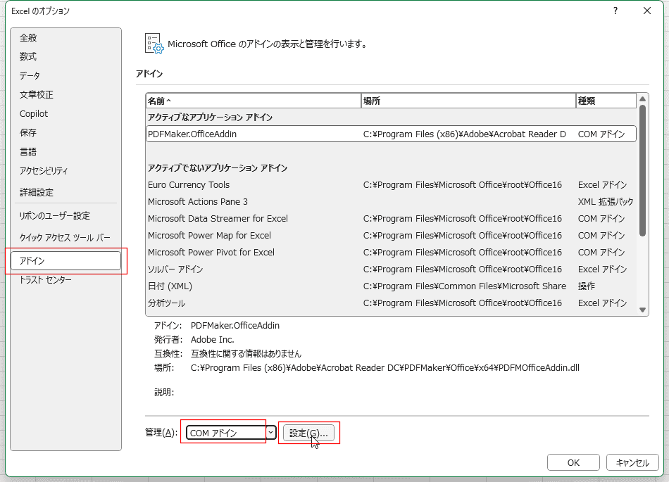 「アドイン」を選択して、管理で「COMアドイン」を選択して、[設定]ボタンをクリックします。