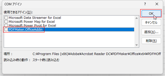 - 「PDFMaker.OfficeAddin」のチェックを外して、[OK]ボタンをクリックします。