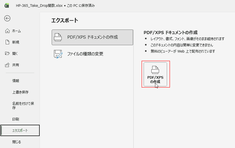 エクスポートの「PDF/XPS の作成」からPDFファイルを作成する