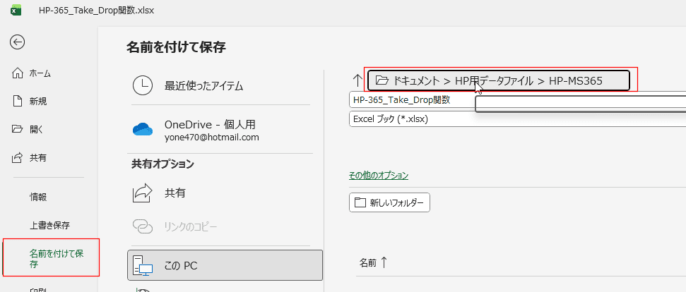- ファイルタブをクリックして、[名前を付けて保存]を選択します。