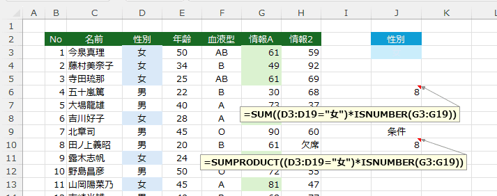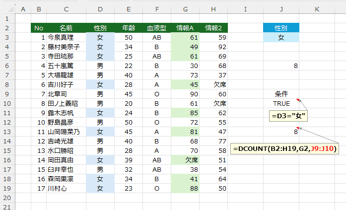 女性の数は9ですが、一人は欠席のため、情報Aの列の数値のセル数は8となります。