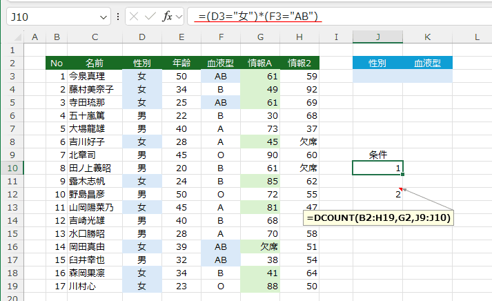 - フィールド名(列見出し)を数式に使うと =DCOUNT(B2:H19,"情報A",J2:J3) となります。