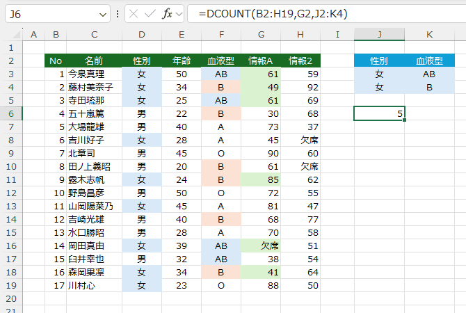 DCOUNT関数の引数のフィールドには "情報A" とフィールド名を入力したり、データベースの列の順番の 6 と入力することもできます。