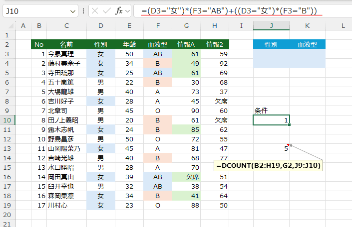 ここでは 条件を =(D3="女")*(F3="AB")+((D3="女")*(F3="B")) としました。