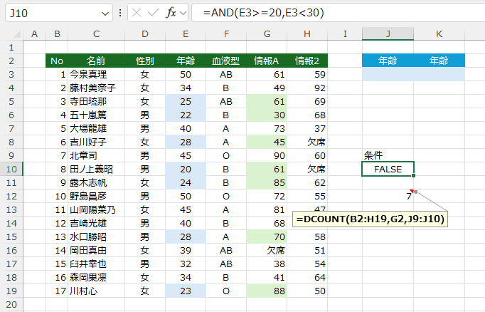 受験者数は =DCOUNT(B2:H19,G2,J9:J10) で求めることができます。
