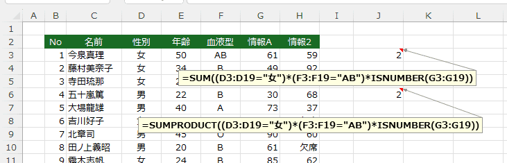 - なお、条件は =(D3="女")*((F3="AB")+(F3="B")) と書くこともできます。