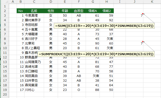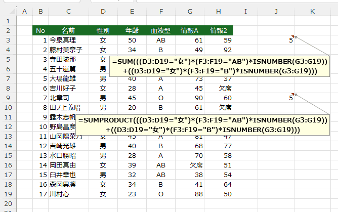 - =SUMPRODUCT((D3:D19="女")*ISNUMBER(G3:G19))