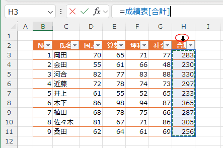 J3セルには =FILTER(成績表[氏名],成績表[合計]>=300) と入力します。