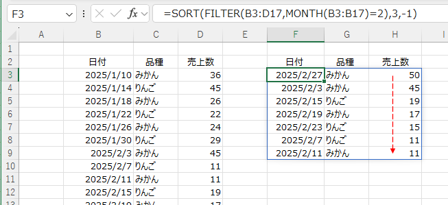 数式は =SORT(FILTER(売上表,MONTH(売上表[日付])=2),3,-1) とします。