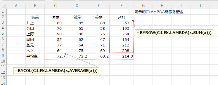 BYROW 関数 | LAMBDA を各行に適用し、結果の配列を返します。 たとえば、元の配列が 3 列 x 2 行の場合、返される配列は 3列 x 1行です。 |