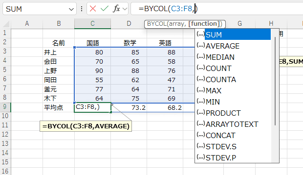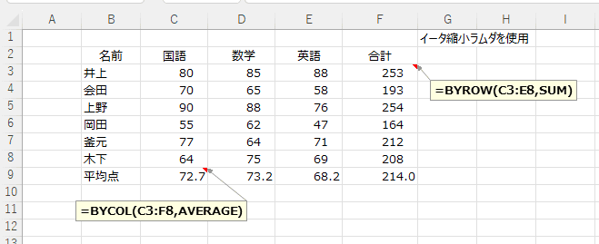 BYCOL 関数 | LAMBDA を各列に適用し、結果の配列を返します。 たとえば、元の配列が 3 列 x 2 行の場合、返される配列は 1列 x 2行です。 |