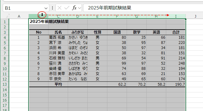 - リボン操作では、B列からI列を選択して、