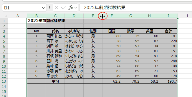 - 自動調整したい列を選択します。