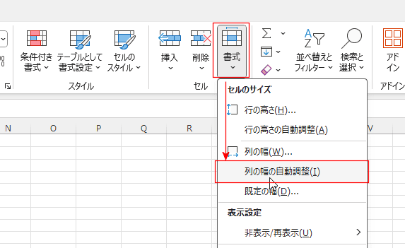 - [ホーム]タブのセル グループの[書式]→[列の幅の自動調整]を実行します。