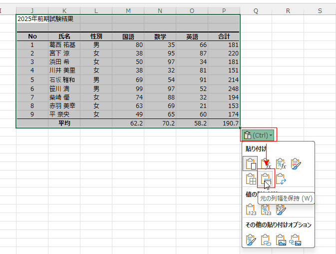 - 列幅を保持した状態で貼り付けができました。