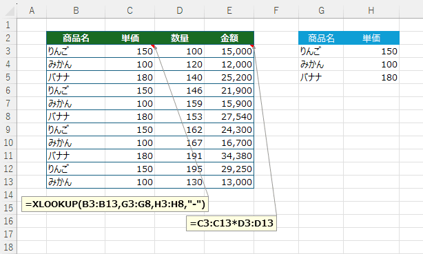 - C3セルには =XLOOKUP(B3:B13,G3:G8,H3:H8,"-")