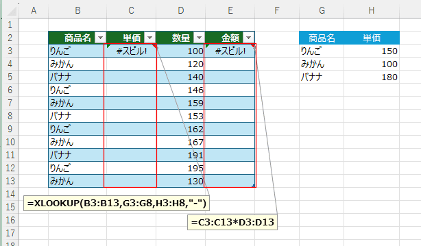 - [挿入]タブの[テーブル]を実行して、テーブルに変換すると、数式を入力したところが #スピル! とエラーになります。