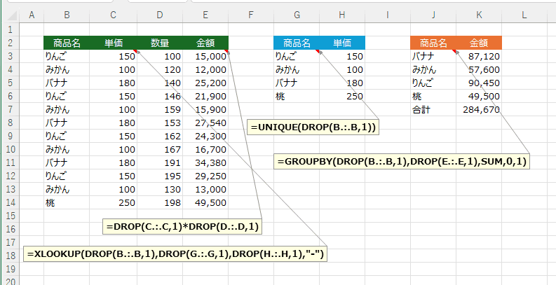 J3セルの数式 =GROUPBY(DROP(B.:.B,1),DROP(E.:.E,1),SUM,0,1)