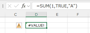 =SUM(1,TRUE,"A") は #VALUE! となります。