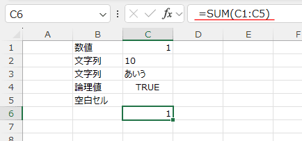 B1セルの数値「1」のみが計算されますので、=SUM(C1:C5)=1 となります。
