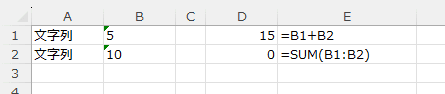 ちなみに、=SUM(B1:B2) では文字列のセルは無視されますので、0となります。