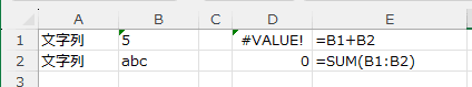 - なお、=B1+B2で数値と見なされない文字列のセルがある場合にはエラーとなります。