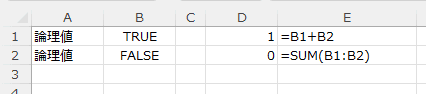 ちなみに、=SUM(B1:B2) では論理値のセルは無視されますので 0となります。