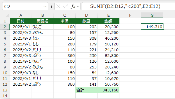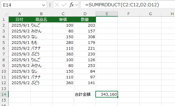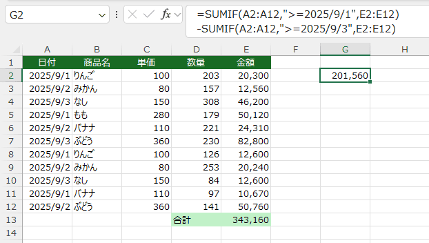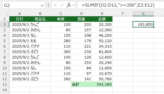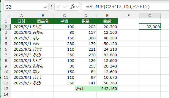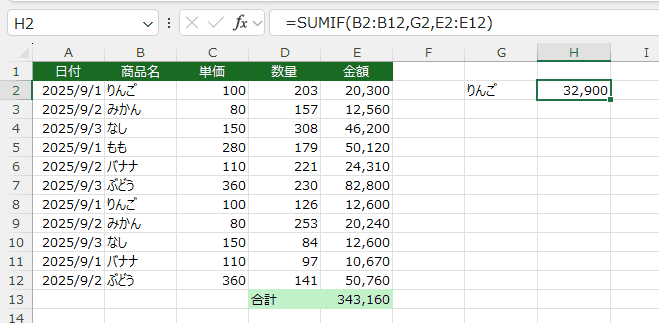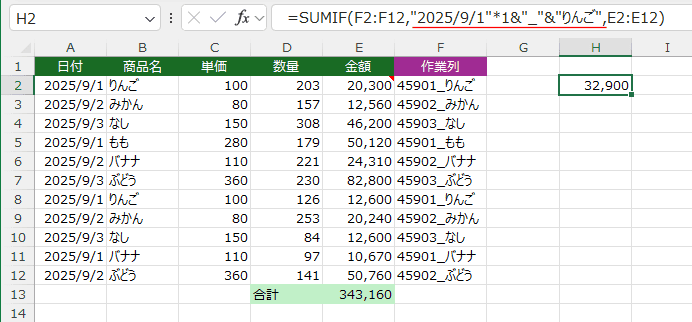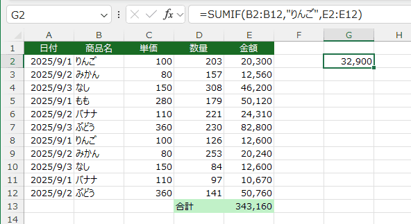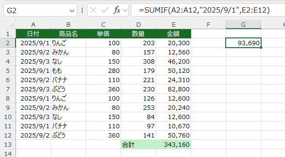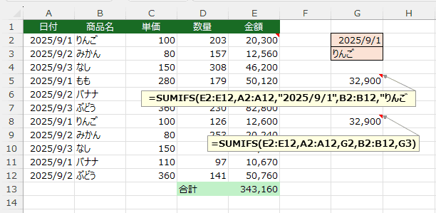 =SUMIFS(E2:E12,A2:A12,"2025/9/1",B2:B12,"りんご")