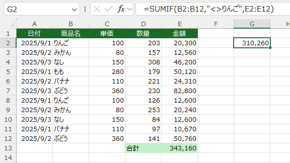 - G2セルに「りんご」と入力されていて、りんご以外の金額を合計する