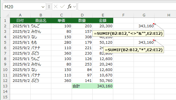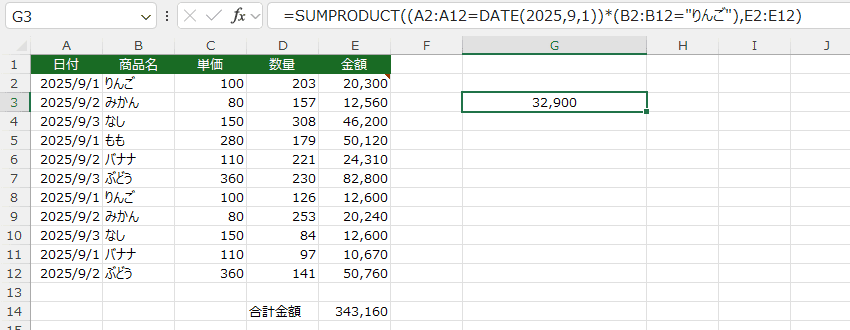 =SUMPRODUCT((A2:A12=DATE(2025,9,1))*(B2:B12="りんご"),E2:E12)
