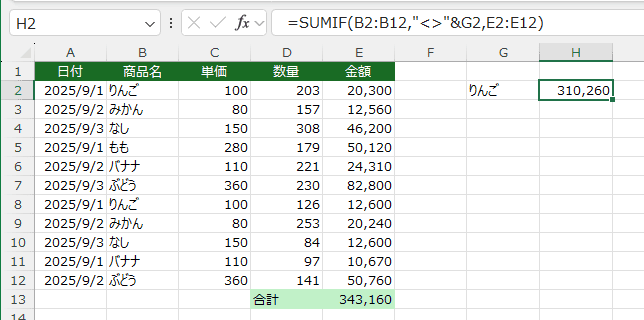 =SUMIF(B2:B12,"<>りんご",E2:E12)