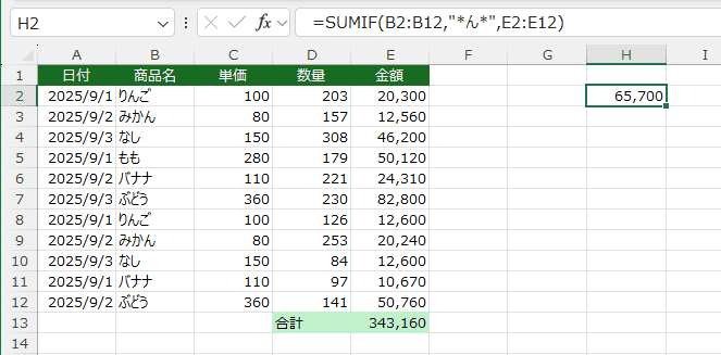 - 商品名に「ん」を含むもの(この例ではりんごとみかん)の金額を合計する