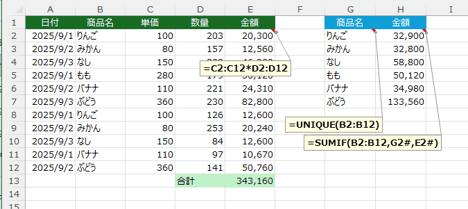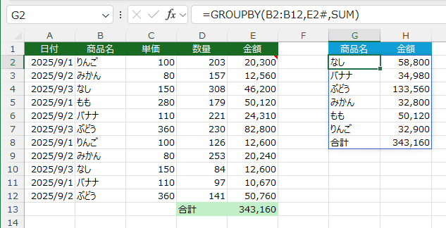 金額はH2セルに =SUMIF(B2:B12,G2#,E2#) と入力しています。
