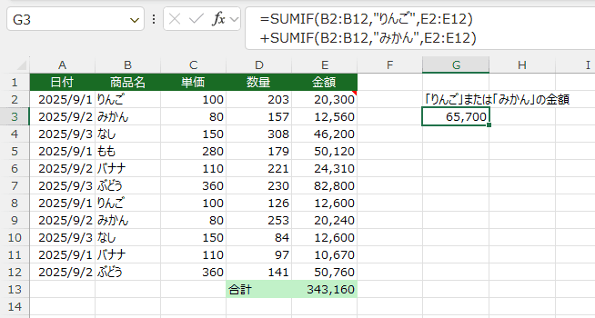 - =SUMIF(B2:B12,"りんご",E2:E12)+SUMIF(B2:B12,"みかん",E2:E12)