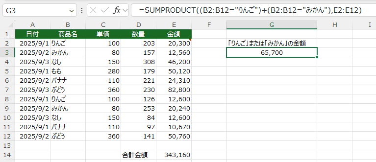 =SUMPRODUCT((B2:B12="りんご")+(B2:B12="みかん"),E2:E12)