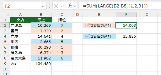 - LARGE(B2:B8,{1,2,3})と配列を使って取り出し、SUM関数で合計します。
