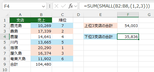 - SMALL(B2:B8,{1,2,3})と配列を使って取り出し、SUM関数で合計します。