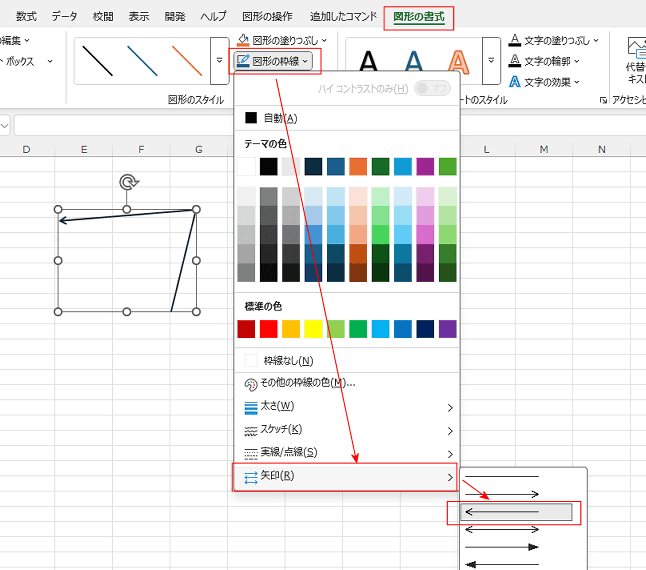 - [図形の書式]タブの図形のスタイルグループの[図形の枠線]→[矢印]→[矢印スタイル9]を選択しました。