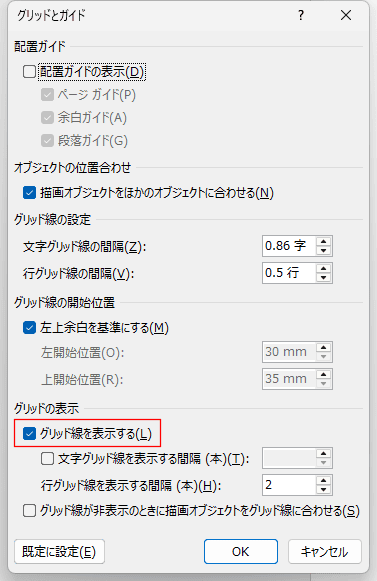 [文字と行数]タブの下部にある[グリッド線]をクリックします。