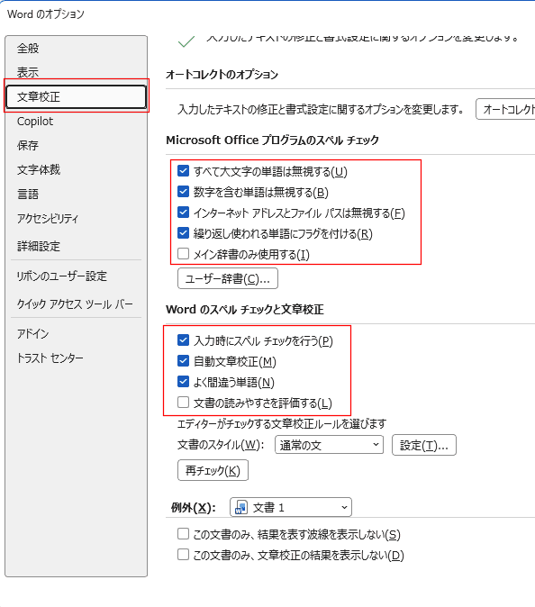 - [文章校正]を選択して、必要と思われるものにチェックを入れます。