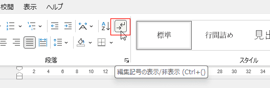 - [表示]タブの表示グループの「ルーラー」のチェックが外れていないか確認しましょう。