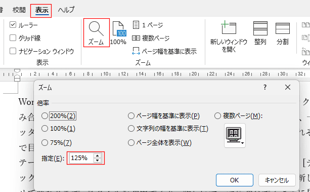 - [表示]タブのズームグループの[ズーム]をクリックします。