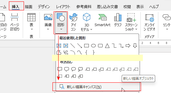- Word2007以降は描画キャンパスは表示されず、表示したいときは、[挿入]タブで[図形]→[新しい描画キャンパス]を選択します。