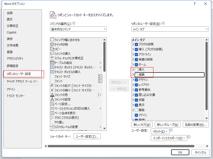 [リボンのユーザー設定]を選択します。