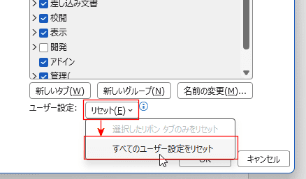 - 右下にある[リセット]→[すべてのユーザー設定をリセット]をクリックします。