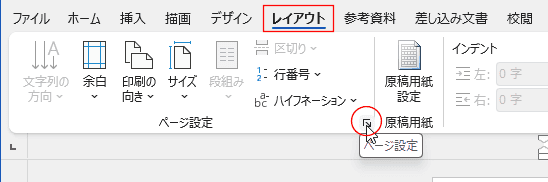 - [レイアウト]タブのページ設定グループのダイアログボックス起動ツールをクリックします。