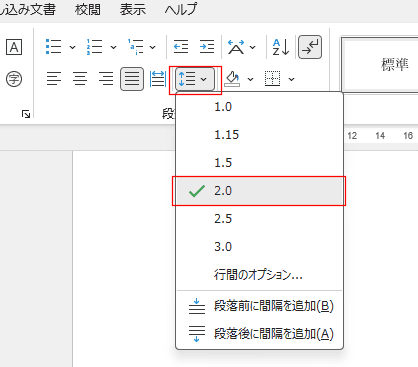 - [行間のオプション]を選択すると、段落ダイアログが表示されます。